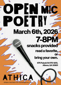 Join us Friday, March 6th from 7 to 8 PM at ATHICA for an open mic night. This is the first night of what will become a regular monthly event, so come be part of the very beginning!