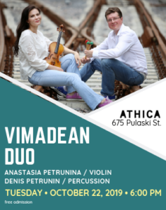 Music by ViMaDeAn Duo, Featuring Denis Petrunin on Marimba and Anastasia Petrunina on Violin: Tuesday, October 22, 2019, 6:00 PM